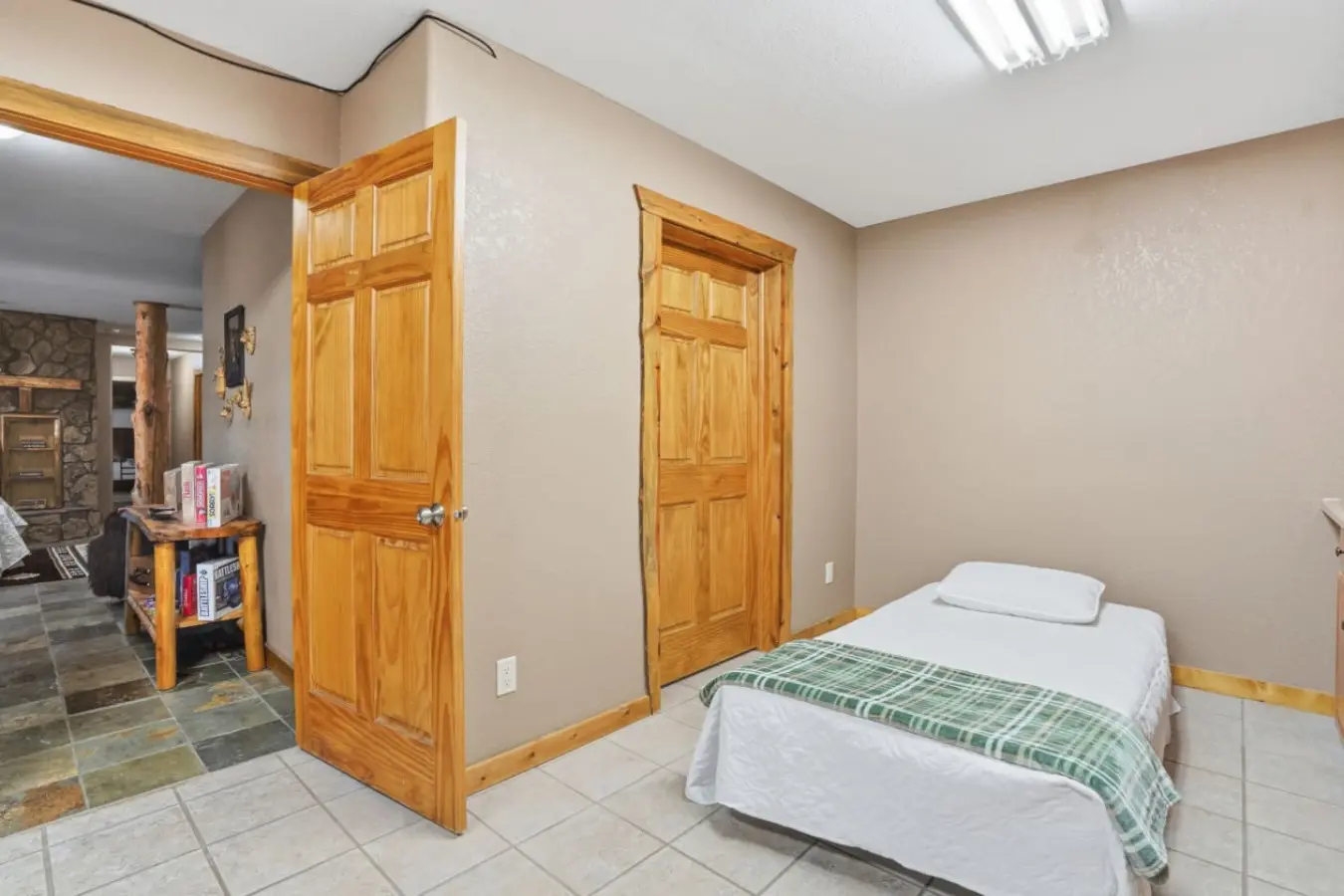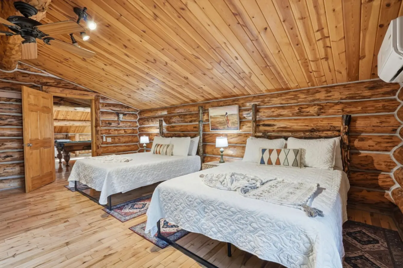 Pool table area and a bedroom with two beds.