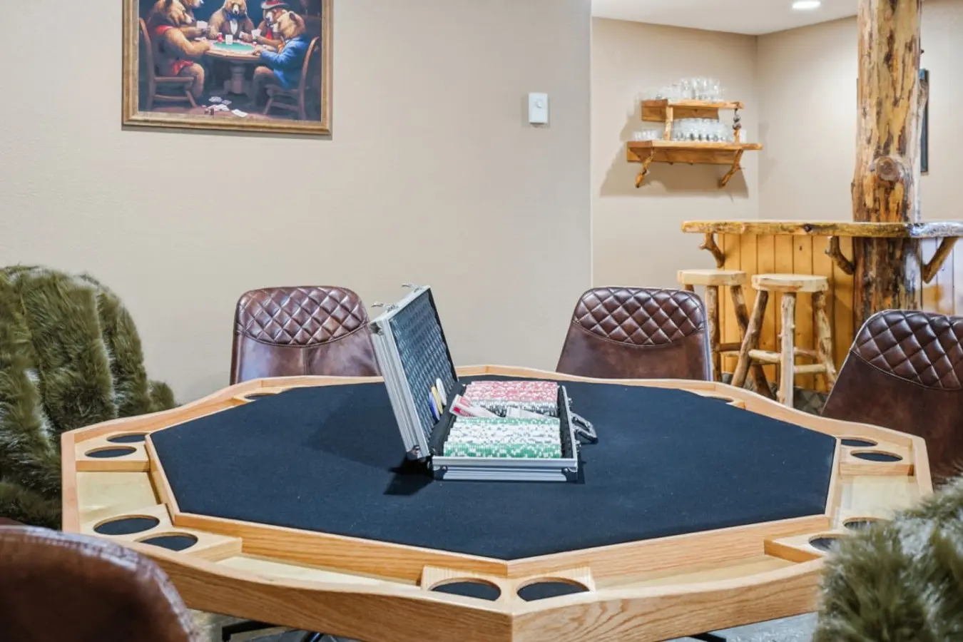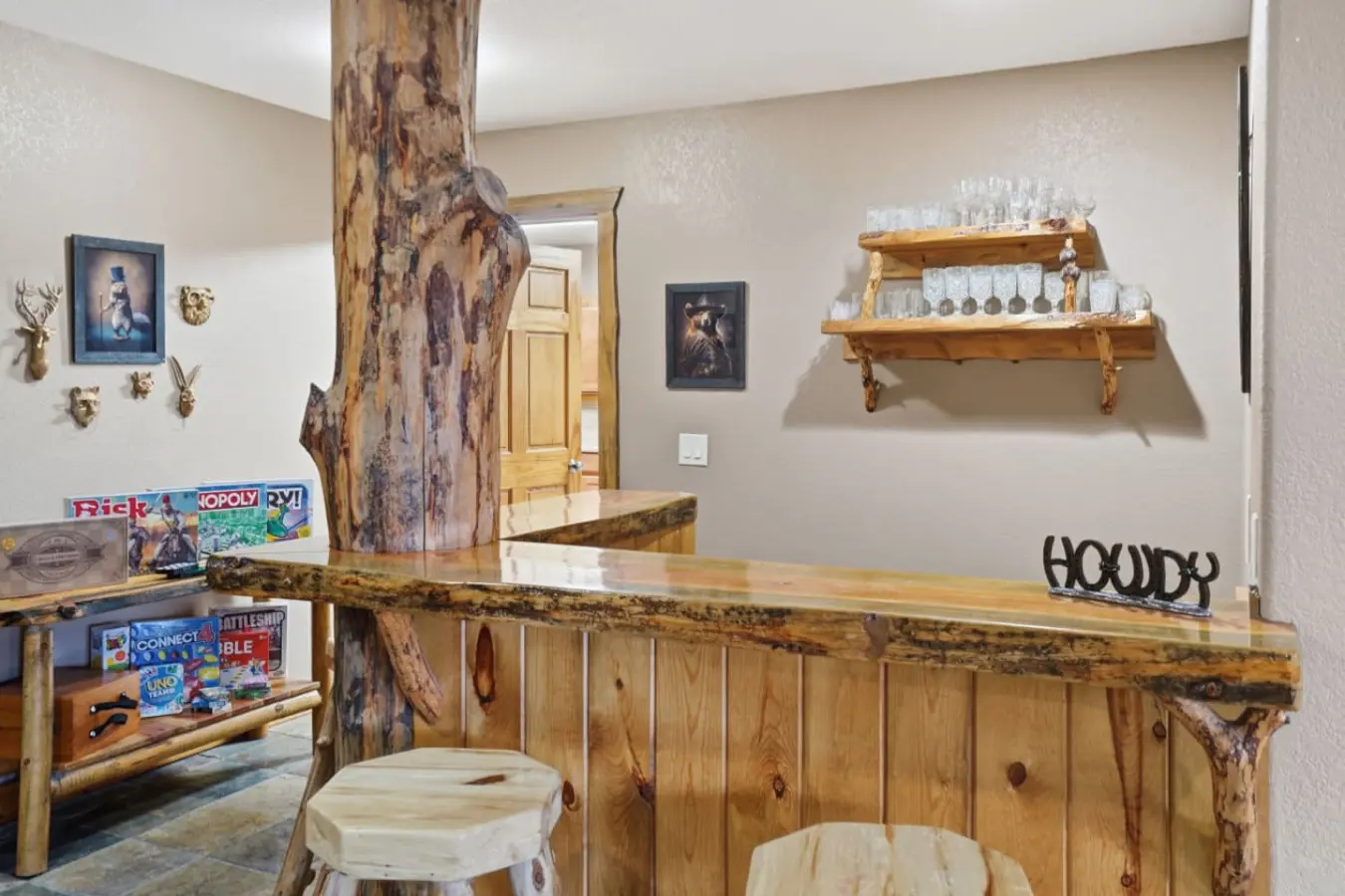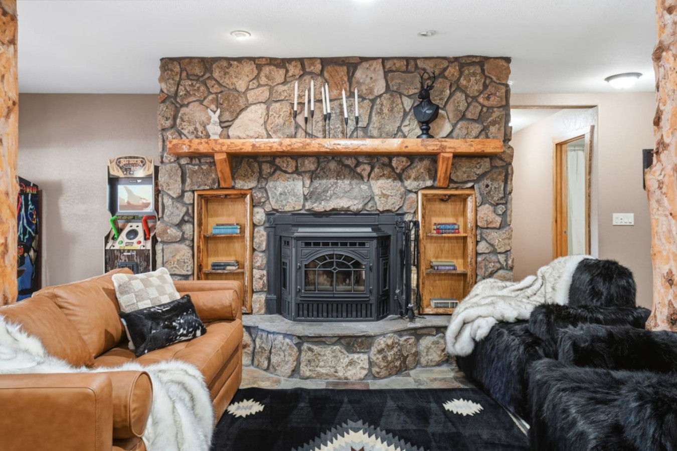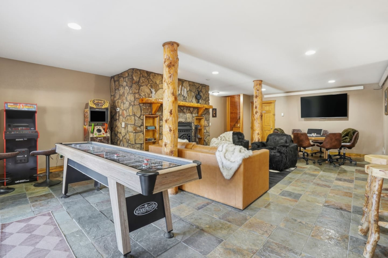 Step into the perfect blend of luxury and natural beauty. This private retreat offers exceptional amenities, including spacious front and back decks, a cozy chiminea fireplace area on the main level, a dedicated game room on the lower level, and a pool table for hours of entertainment, all complemented by the comforts of a resort-style escape. With four beautifully furnished bedrooms and additional sleeping areas, the home strikes an ideal balance between refined comfort and total relaxation.