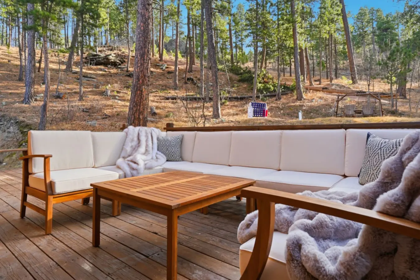 Thoughtfully designed for relaxation and gathering, featuring a unique green room that seamlessly blends indoor and outdoor living, an expansive front deck, and a spacious back deck ideal for enjoying the surrounding scenery. Comfortable L-shaped outdoor couch seating creates the perfect place to unwind, while the hot tub invites you to soak under the open sky. With a fire pit, grill, and large outdoor dining table, you’ll have everything you need for memorable meals and evenings together.