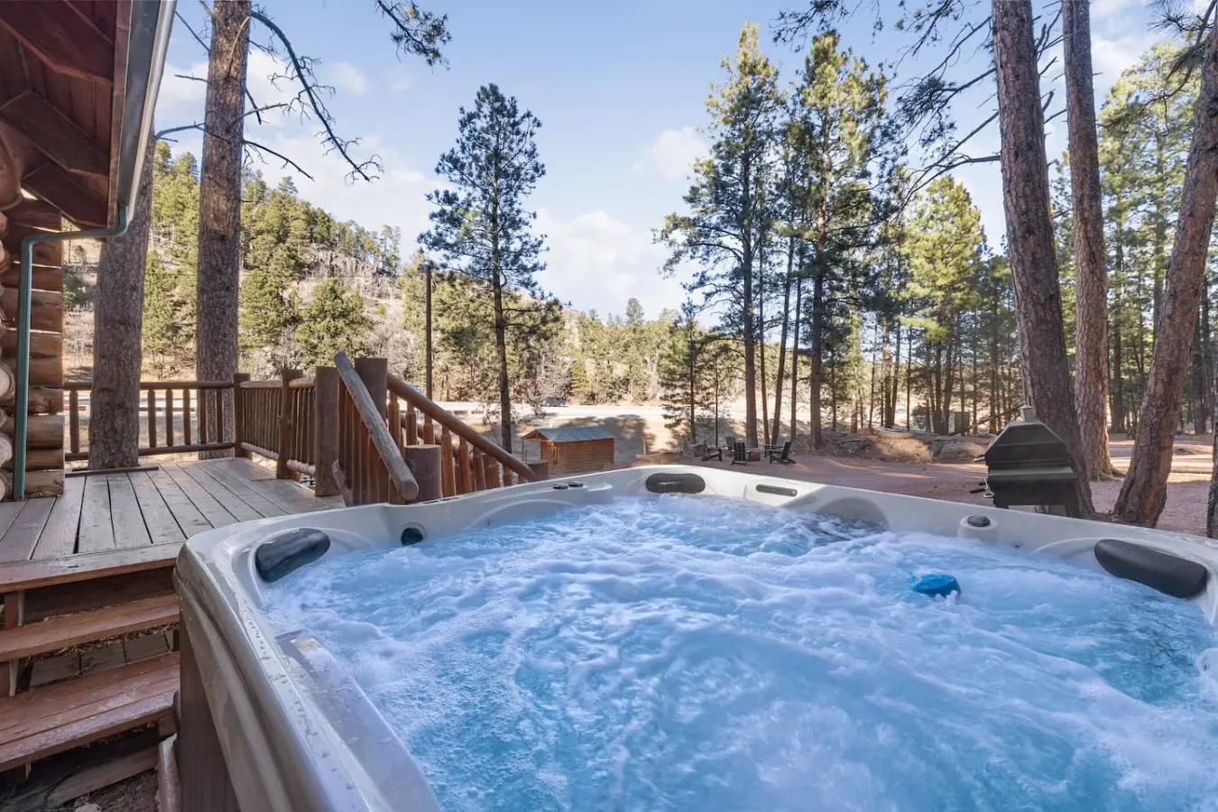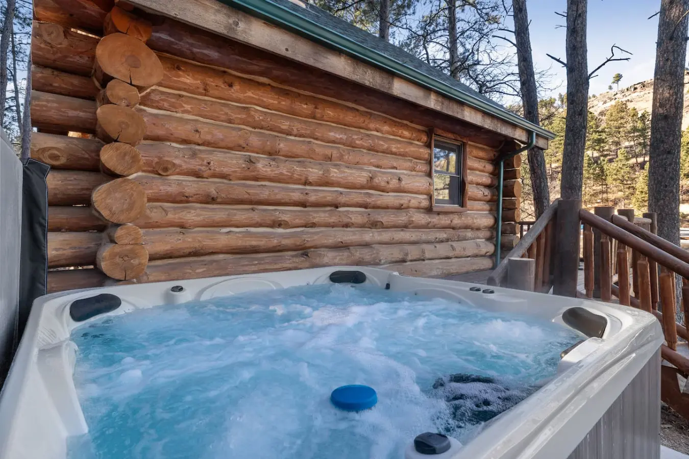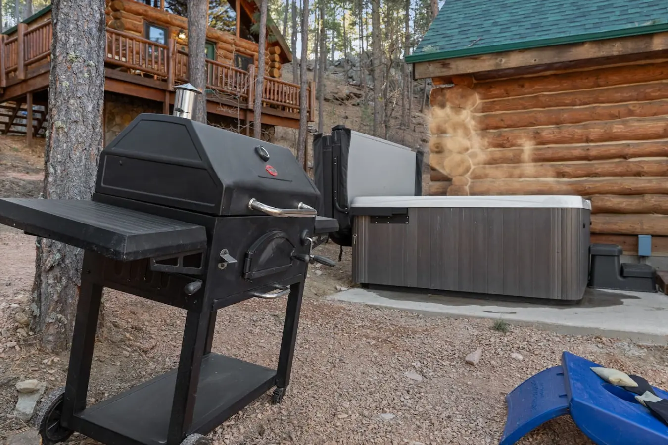 Outdoor amenities include deck furniture, a charcoal grill, a private hot tub, and access to the community firepit. Peaceful surroundings and frequent wildlife sightings create a quiet and memorable Black Hills escape.