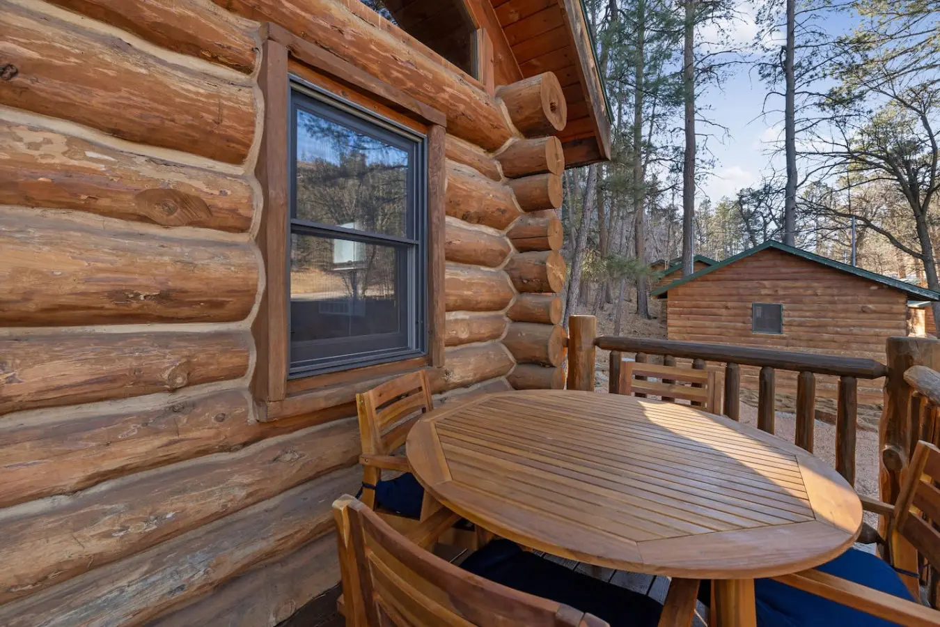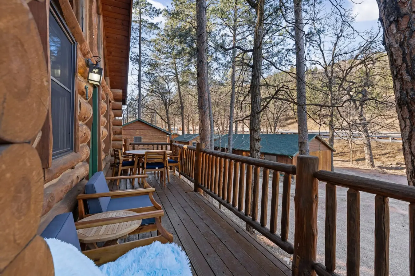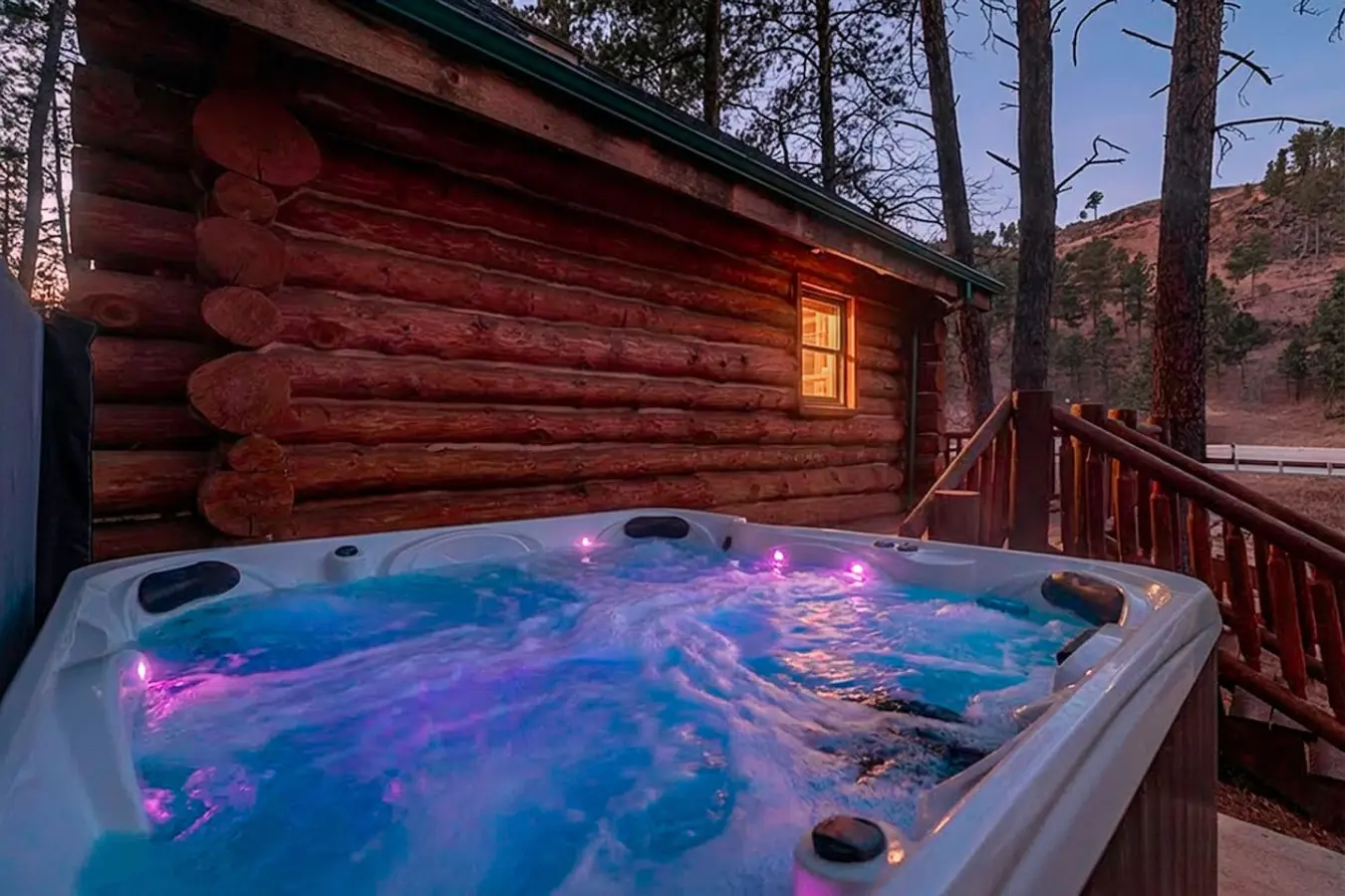 Outdoor amenities include deck furniture, a charcoal grill, a private hot tub, and access to the community firepit. Peaceful surroundings and frequent wildlife sightings create a quiet and memorable Black Hills escape.